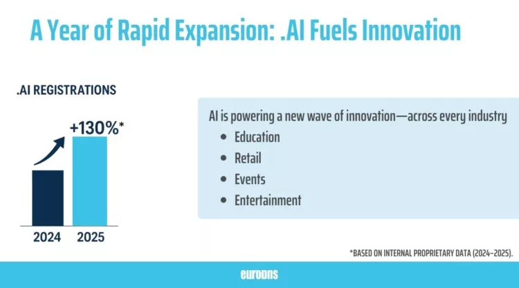 This global trend is mirrored in our own internal numbers at EuroDNS, where .ai registrations have increased by more than 130% year-on-year from 2024 to 2025.